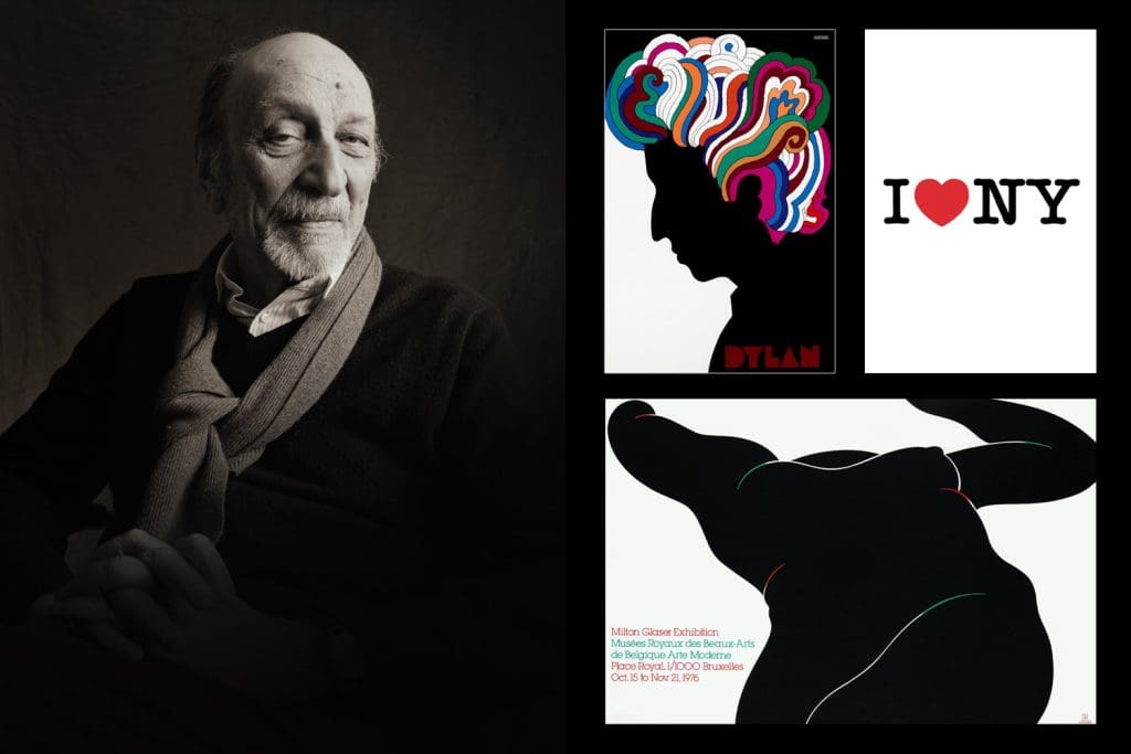 Milton Glaser by Michael Somoroff, 2013 / Works by Milton Glaser: Bob Dylan Poster by Milton Glaser, 1967 / I ♥ New York, 1977 / Black Foreshortened Nude, 1976